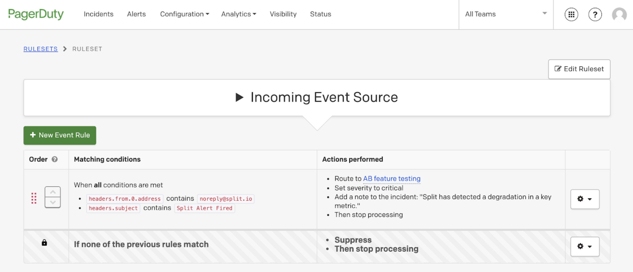 The actions performed by my rule are to route to an appropriate service -- “AB feature testing” -- set the severity to critical and label the incident with a note that “Split has detected a degradation in a key metric”. You can specify whatever action you think is most appropriate; PagerDuty is incredibly flexible in its response to the alerts.