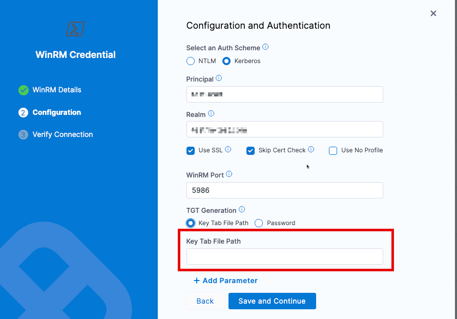 Password: Create or select an existing encrypted file secret that contains the relevant WinRM key file.