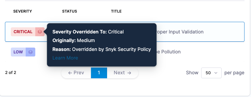 Show original issue severities overridden by Snyk security policies