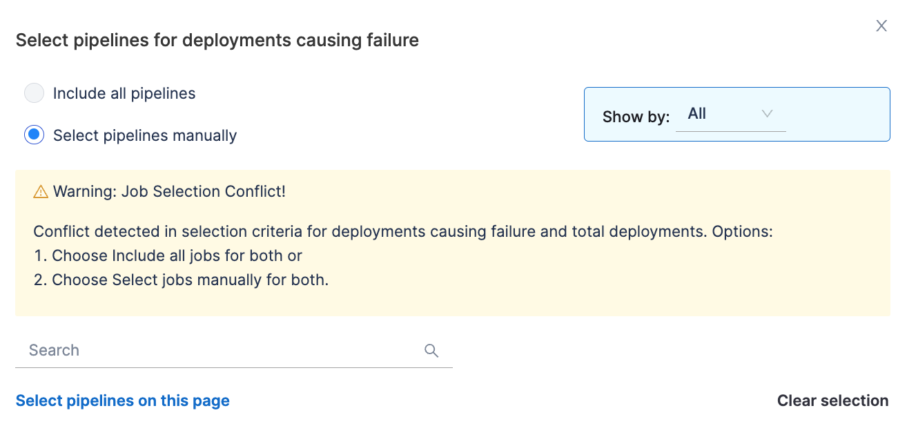 - Configure additional attributes to identify deployments that result in failure. By default, all pipelines are included, but you can customize the selection by manually specifying which pipelines should be included.