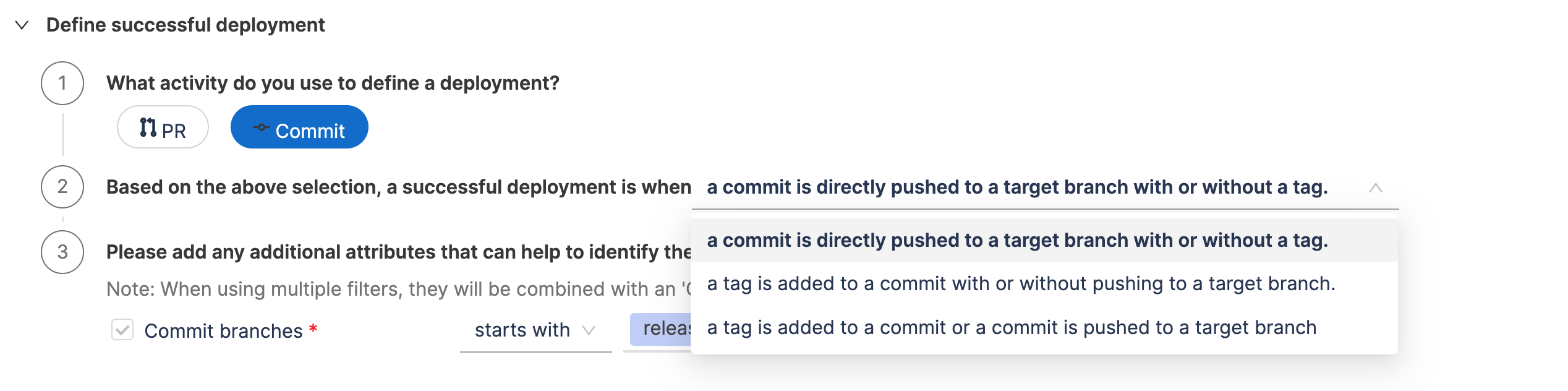 - Define additional attributes to identify deployments causing failure and total deployments. When using multiple filters, they will be combined with an 'AND' operation.