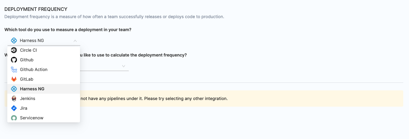- Select the relevant ServiceNow integrations that you wish to use for calculating change failure rate.